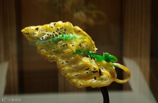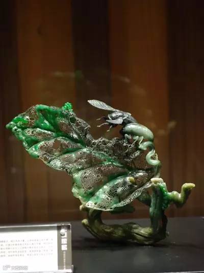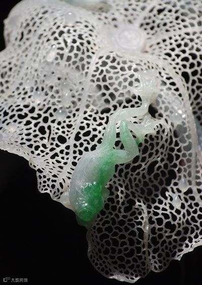 2】密密的镂空叶脉上交织成网状,一只小青蛙跃于荷叶之上,仿佛能看到叶子在轻轻的颤动。谁能相信,这是又硬又重的翡翠石头雕琢出来的?