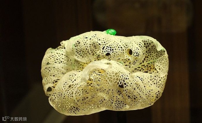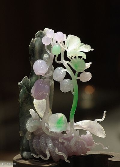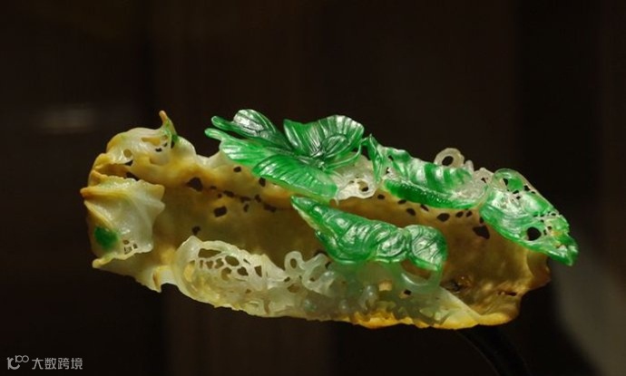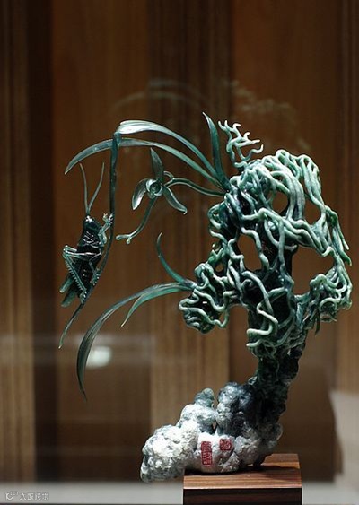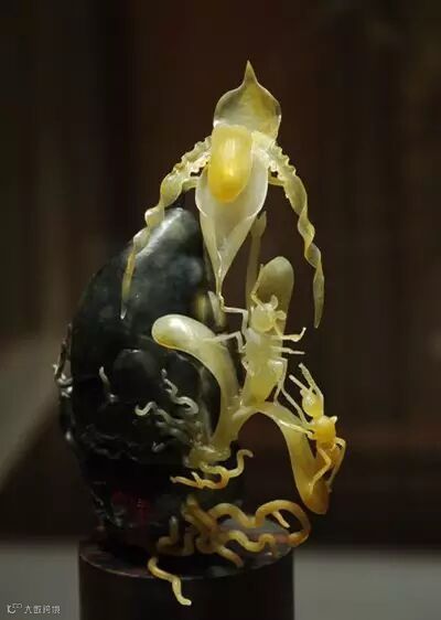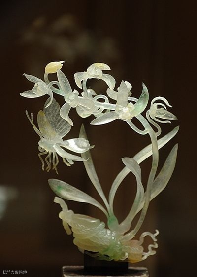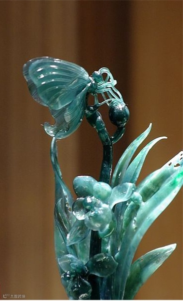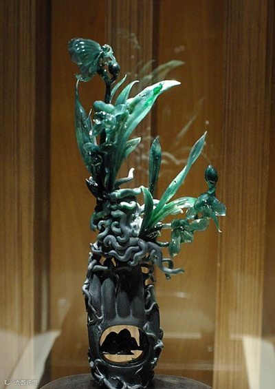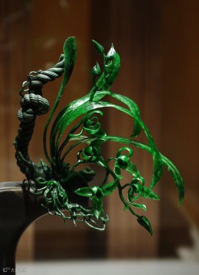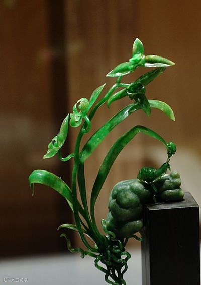 这是一块原本10公斤重的老坑种翡翠原石,硬是被雕琢成了一片片悬空的兰叶。坚硬的翡翠化成了柔软的线条,什么叫做不惜工本哪!