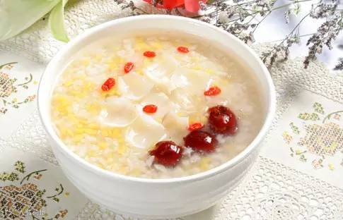 第一粥:百合粥 百合味甘微苦,性平。其营养成分丰富,有蛋白质、维生素、胡萝卜素及一些特殊的有效成分,如淀粉、多糖、果胶以及多种生物碱,对抑制癌细胞增生有一定的疗效。百合有润肺止咳,清心安神等功效,成为秋季食用之上品。最佳吃法:煮粥。百合可当菜肴吃,如西芹炒百合、百合炒牛肉;也可煮粥吃,如百合与糯米制成百合粥,放上一点冰糖,不仅可口,而且安神,有助于睡眠。最好搭配:杏仁。杏仁有润肺止咳,清心安神的功效,搭配百合熬粥适用于病后虚弱、干咳患者。