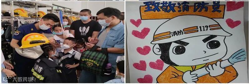 。最后,小朋友们给消防员送上自己的消防绘画作品和鲜花。