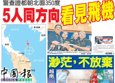 在政府和军方的衬托下,马来西亚的媒体在“把全世界逼疯”的过程中所做贡献最小,主要因为新加坡和越南两个邻国媒体实在太彪悍,3月8日当天新加坡晚报就在头版用鲜红的大字登出“马航客机坠海”;越南媒体则每天发布“已发现飞机残骸”,“残骸在这里”,“不对,残骸在那里”等残骸系列报道博眼球。风头都被抢去,难以出彩的马来西亚媒体厚积薄发,终于在搜索消息几无进展的时候放出重磅炸弹——