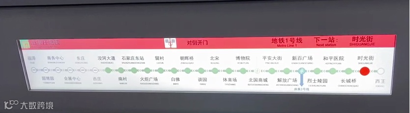 2、车门上方的动态地图,有运行路线,动态地图会显示终点站。小交路的动态地图显示西庄站-福泽站图标关闭,运行的大交路动态地图显示所有车站图标打开。列车在驶出站台时,车厢内的广播会及时进行终点站播报。