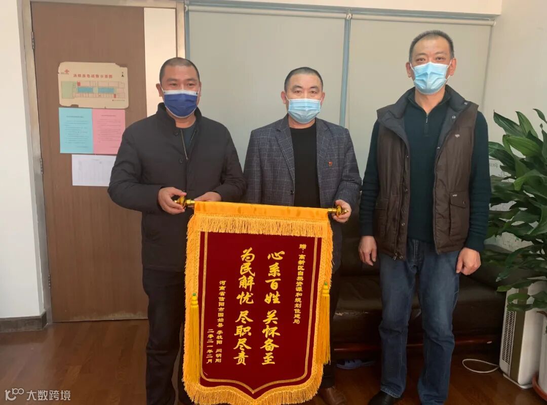 的两位农民工给高新区自然资源和规划住建局送来一面锦旗表达他们的感激之情。