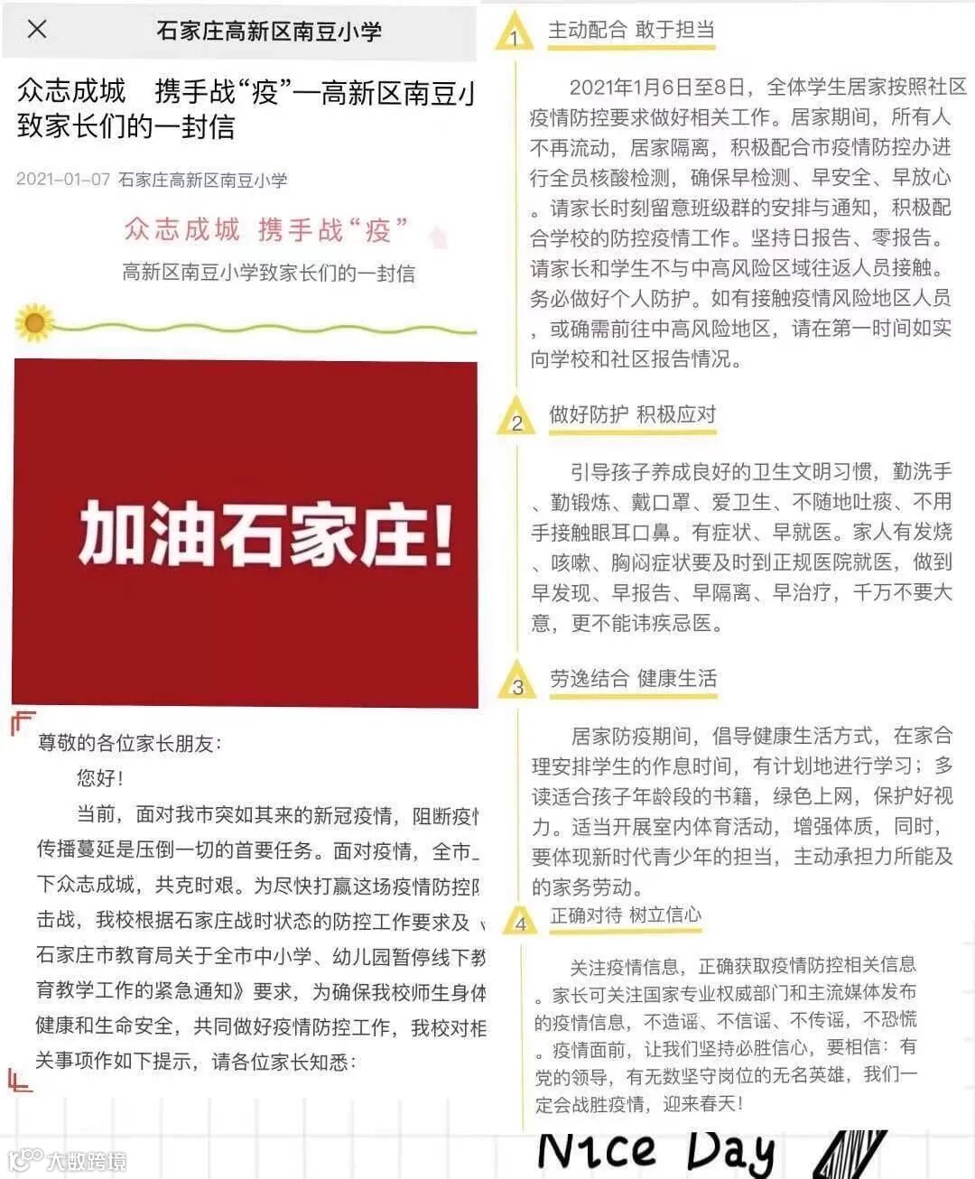 南豆小学在疫情突发之际,立即开启了校园冬季疫情防控预案,及时为师生呈送了一份“心灵处方”,制定心理健康辅导手册。并通过“致家长的一封信”,给家长的心灵戴上健康的“口罩”,共护学生成长前行。