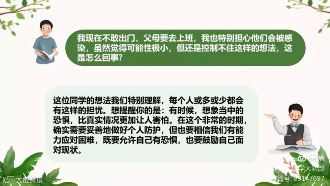 想象国际小学和实验小学从“科学地保护自己远离‘新冠’病毒传染”、“多关注权威的信息发布”、“接纳自己适度的焦虑情绪”、“合理安排生活”四方面入手,为学生提供了居家防护小妙招,帮助学生以积极乐观的心态面对疫情。