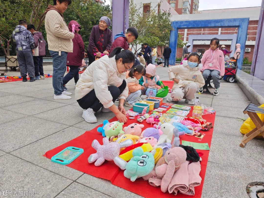 活动当天,气温骤降却挡不住大家的热情,广场被家长和孩子们装点得五彩斑斓,每个摊位前都摆满了孩子们带来的闲置物品,包括玩具、文具、手工艺品、套圈等。活动正式开始后,小摊主们纷纷亮出自己的“宝贝”,热情地招呼着过往的顾客。他们有的用稚嫩的声音吆喝,有的用精美的展示牌吸引眼球。居民们也被这些充满童趣和创意的商品所吸引,纷纷驻足挑选,讨价还价,场面十分热闹。