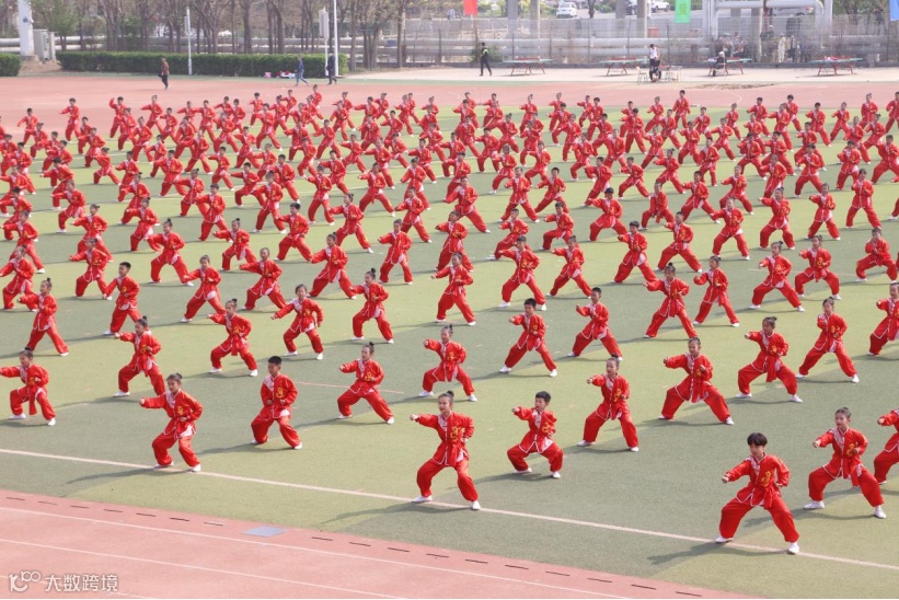 推向高潮,韩通小学的团体操《多彩非遗舞花杆》用花杆舞动春之彩,用战鼓敲动新希望;第一小学的武术操《方圆武韵》,以武育德,以武益智,以武健体,以武展美;私立一中附属小学将戏曲与健身完美结合,用戏曲艺术唱、念、做、打实现体育运动的强身健体;宋营小学的《龙韵传承