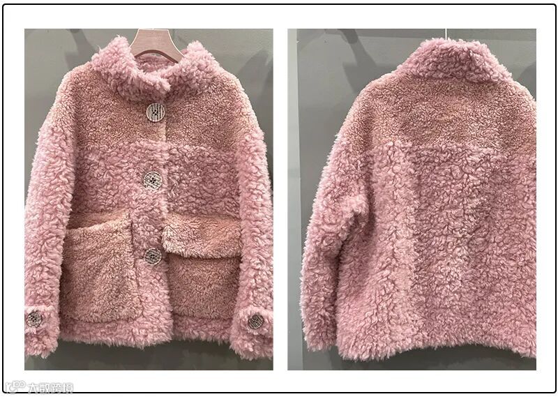 颗粒羊剪绒皮毛一体,卡拉卷+立领设计,十分减龄,粉色也超级显肤色。