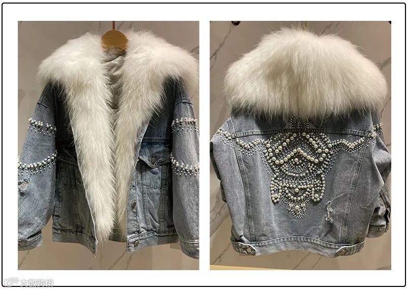 重工貉子毛钉珠牛仔派克服,与生俱来的洋气属性,羽绒内胆,可拆卸,搭配海军领,增添一种软萌萌的调调。