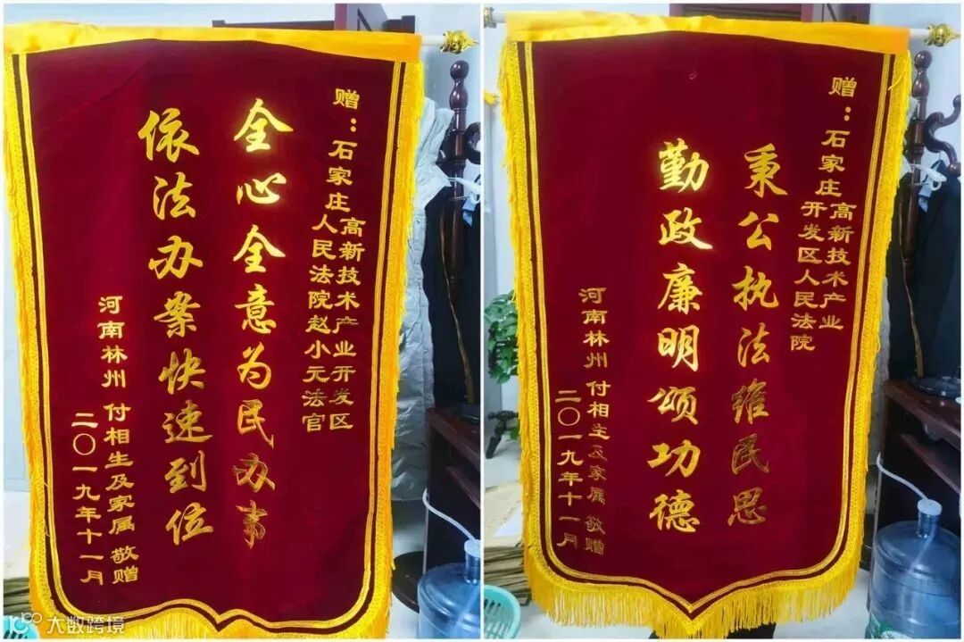 近日,高新区法院执行申请人付某委托儿子为高新区法院和法院执行法官赵小元送来锦旗,感谢法官为他追回了