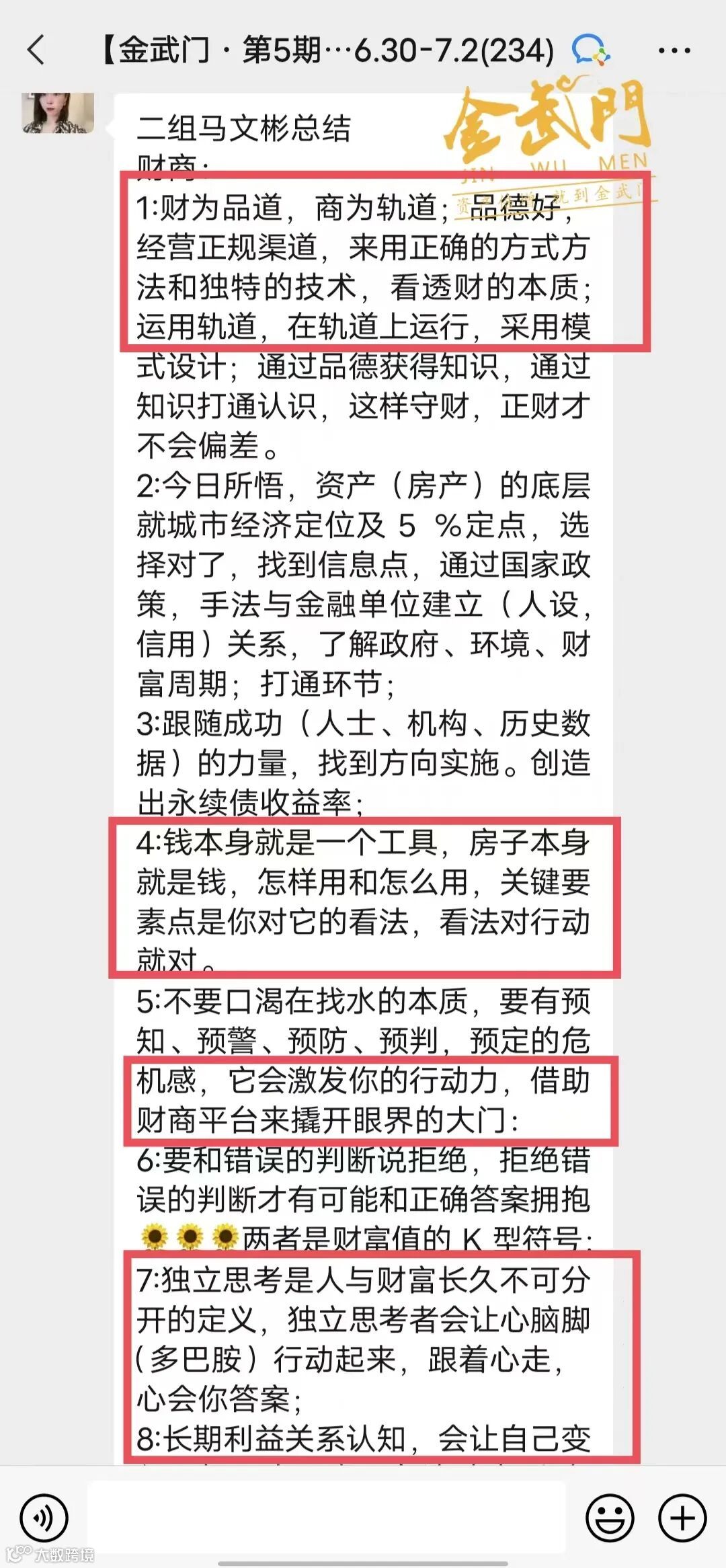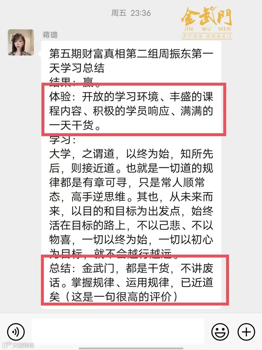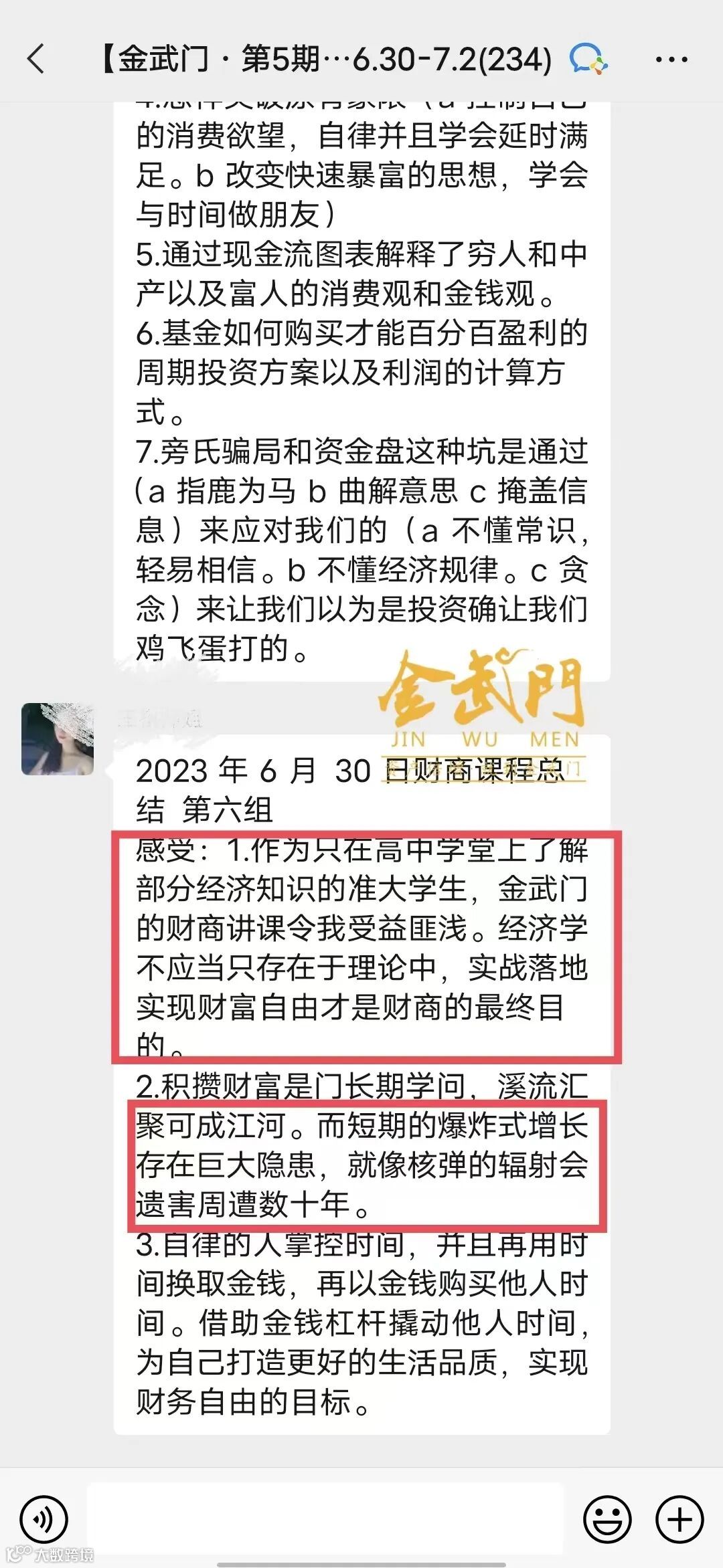老师们从宏观微观不同角度展现财商思路,从经济规律到经济周期,从个人财富落地到家庭财富传承,金武门秉持着“与时间做朋友,慢慢变富”的致富原则,希望帮助大家找到财富卡点,彻底破除自己的痛点问题,帮助天下数万家庭再无“穷疾”。
