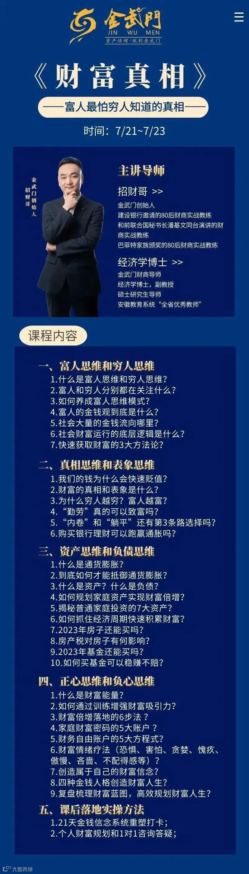 ——资产倍增落地引领者+华东区财商教育第一品牌~金武门集团,于7月21~7月23日合肥隆重召开第6期《财富真相》思维班,三天两夜,让您少奋斗十年!