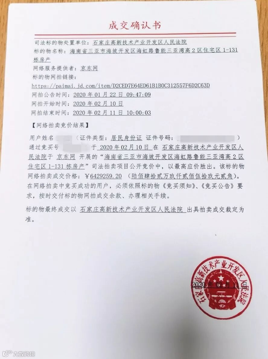 万余元的价格成功被拍出,考虑到当前疫情的影响,法院以网络和邮寄两种途径向成功竞买的用户发送了《成交确认书》,并和相关当事人协商一致,将过户交付等手续适当后延,待疫情有所缓和后尽快处理。