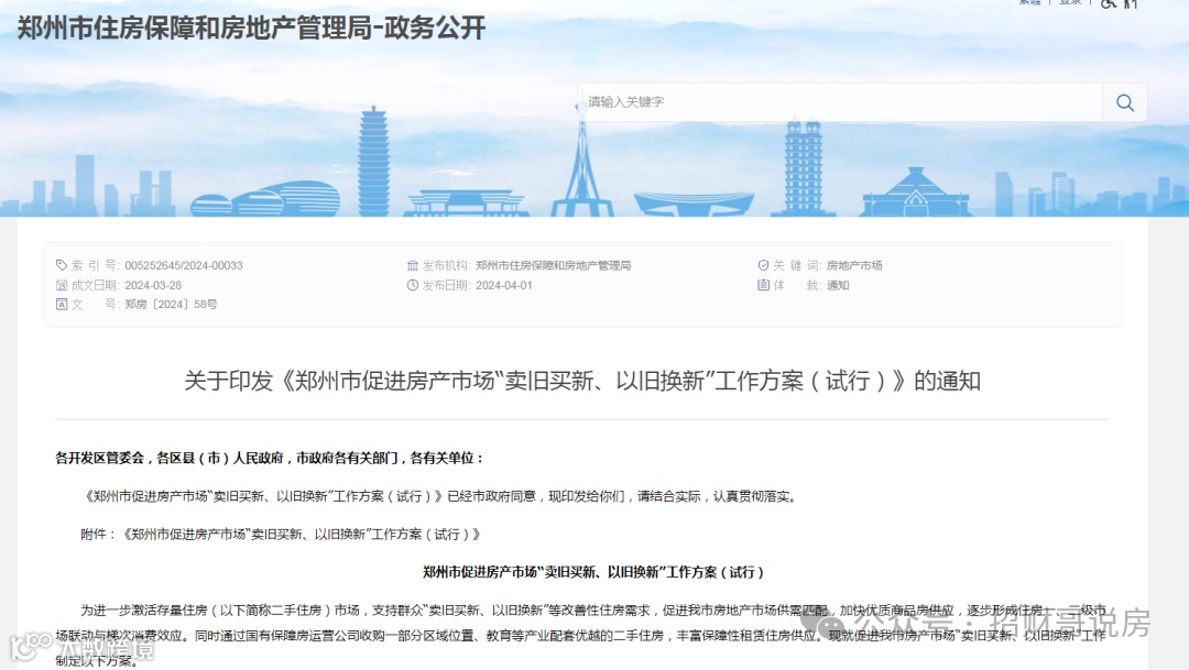 另外,不久前,郑州市房管局等相关部门发布了《郑州市促进房产市场“卖旧买新、以旧换新“工作方案(试行)》。
