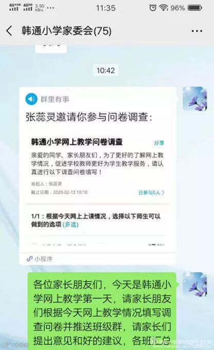 韩通小学张校长及时与家委会成员沟通联系,动员家长参与调查问卷,做到“早发现问题,早解决问题”,让学生与家长隔着屏幕感受到老师们的用心与细心。