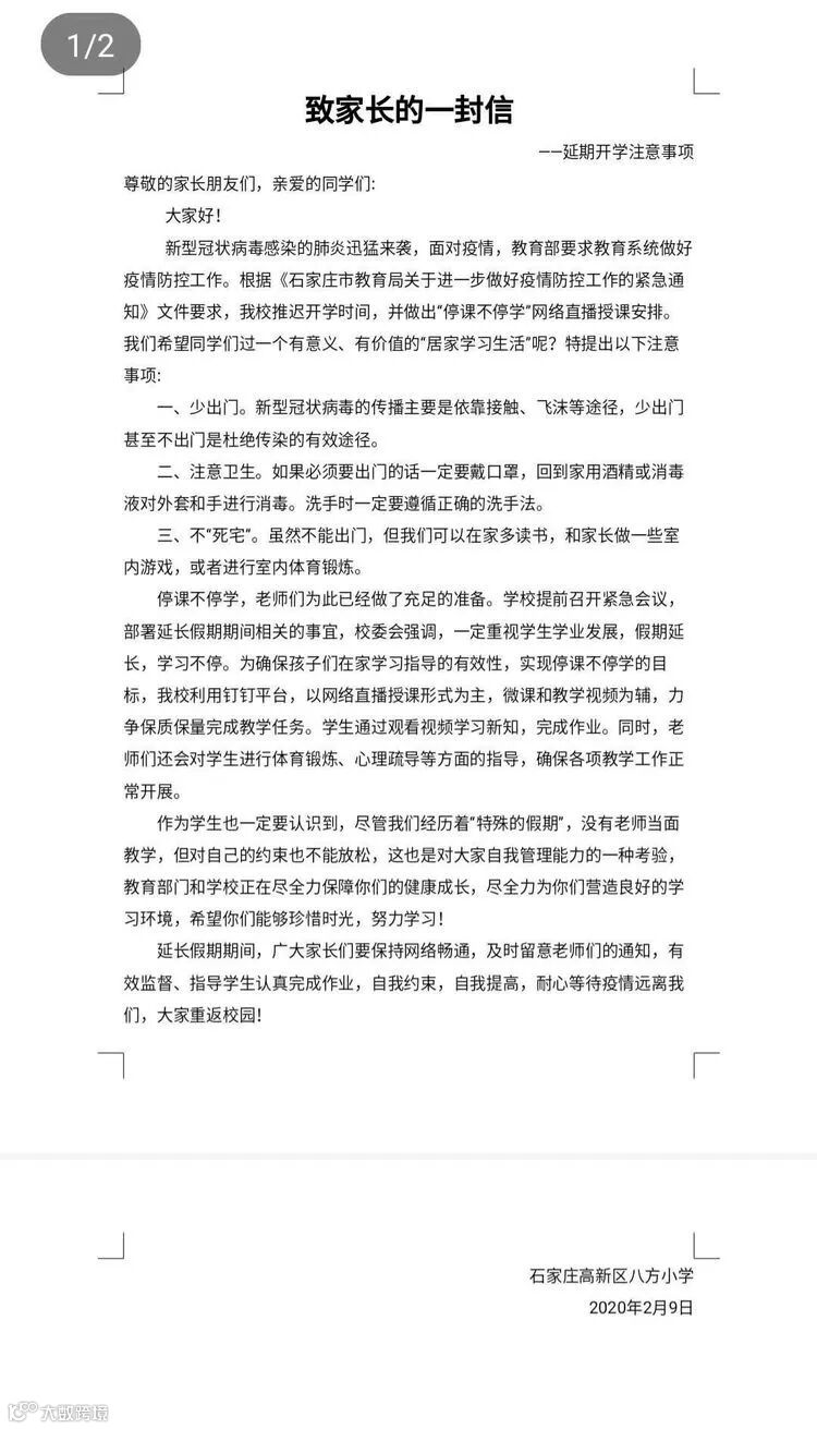 八方小学《致家长的一封信》整理了一系列延期开学注意事项,把学校的工作部署娓娓道来,使家长的理解和学校各项工作的开展成为学生健康发展的“保护墙”。