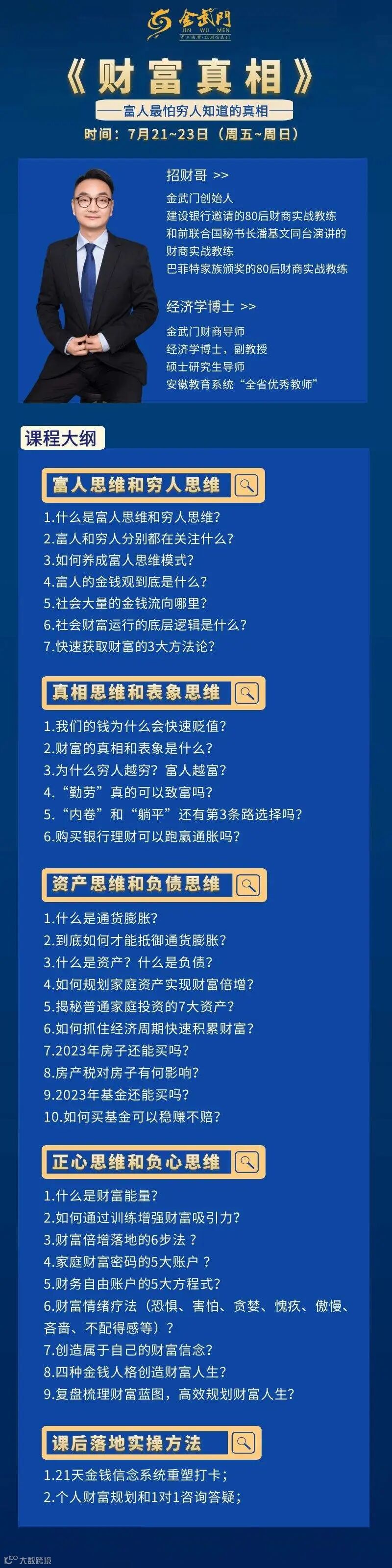 ——资产倍增落地引领者+华东区财商教育第一品牌~金武门集团,于7月21~7月23日合肥隆重召开第6期《财富真相》思维班,三天两夜,让您少奋斗十年!