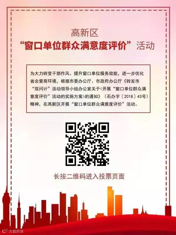 为大力转变干部作风、提升窗口单位服务效能,进一步优化全区营商环境,根据市委办公厅、市政府办公厅《转发市“双问计”活动领导小组办公室关于<开展“窗口单位群众满意度评价”活动的实施方案>的通知》(石办字〔2018〕43号)文件精神,在全区开展“窗口单位群众满意度评价”活动。