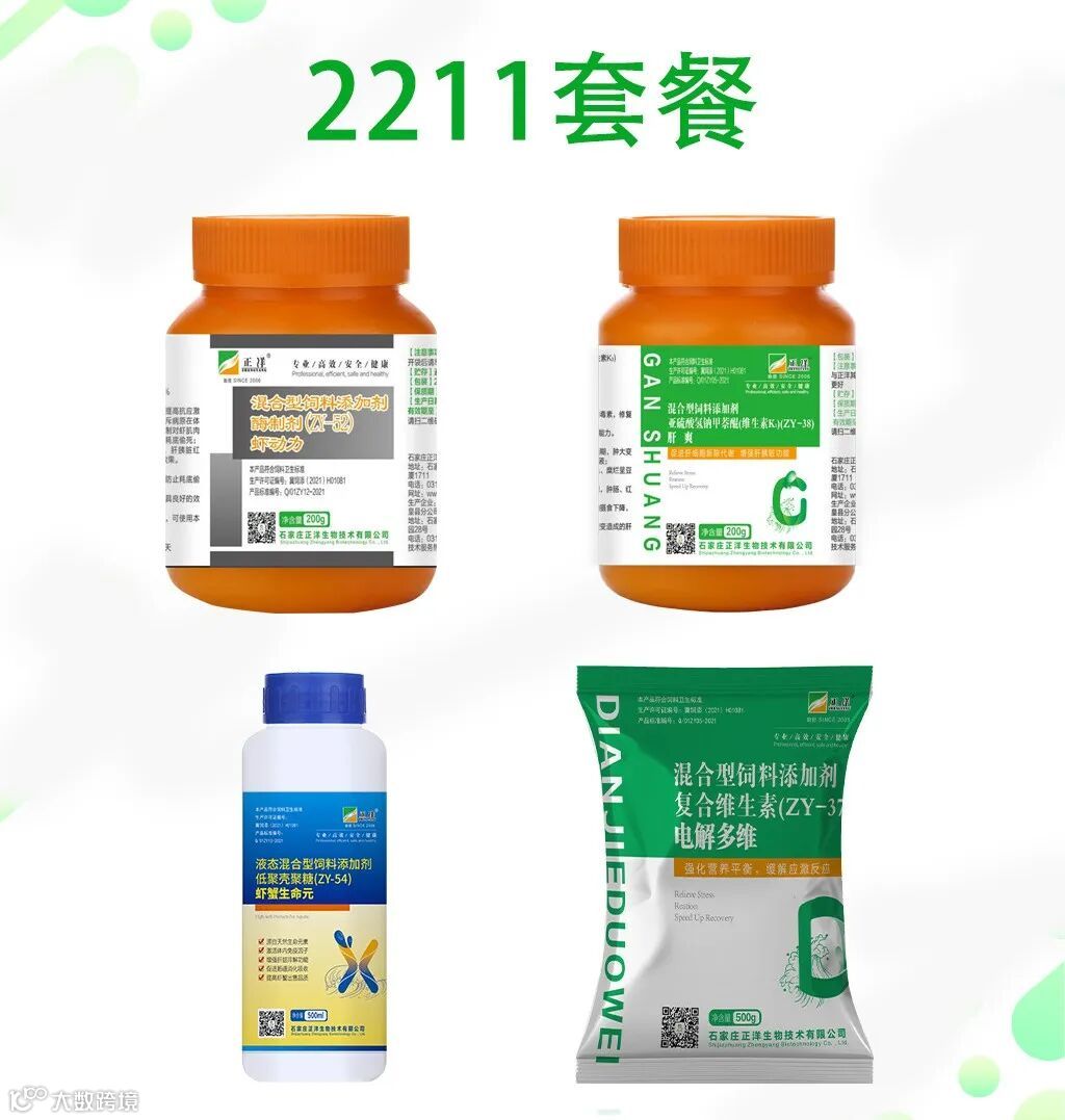 第二天,保肝泼洒剂4亩一袋,同时拌料2211套餐,一天两餐,连用3天;