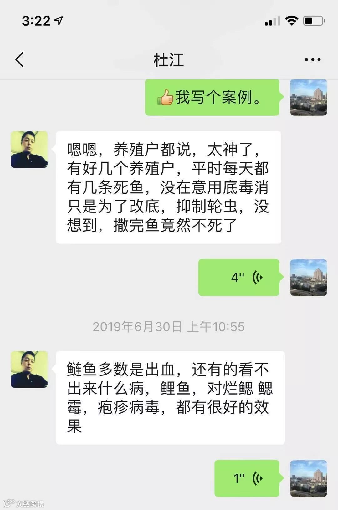 当天鱼就开始吃食了,另外几家客户高温期每天都有十几条死鱼,用了碘、戊二醛、硫醚沙星均未见效果,杜江建议使用底毒消1.5亩/瓶,两天后就停止死鱼。当杜江将这个好消息通知大家时,又有几个养殖户反应,进入高温期每天都有几条死鱼,使用了底毒消,初衷只是为了改底,抑制轮虫,没想到用完之后,鱼居然一条也不死了!