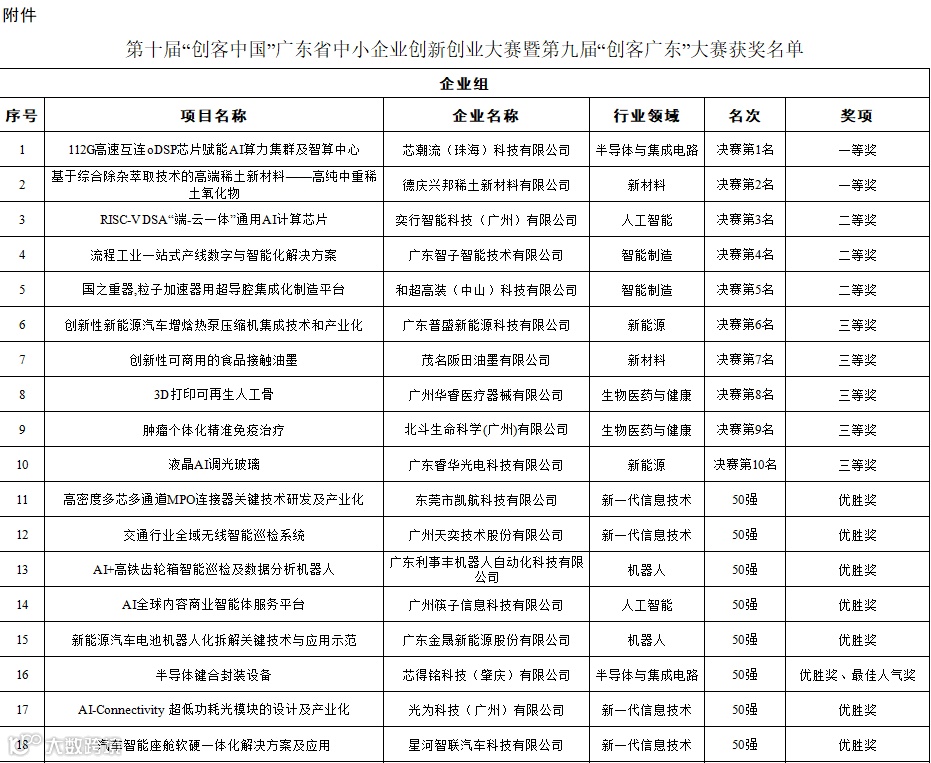 由广东省工业和信息化厅、东莞市人民政府共同主办的第十届“创客中国”广东省中小企业创新创业大赛暨第九届“创客广东”大赛自2025年4月启动以来,经过项目征集、初赛(包括地市赛及专题赛)、复赛,并于2025年9月9日举行决赛,现已圆满结束。芯潮流(珠海)科技有限公司的“112G高速互连oDSP芯片赋能AI算力集群及智算中心”项目和德庆兴邦稀土新材料有限公司的“基于综合除杂萃取技术的高端稀土新材料——高纯中重稀土氧化物”项目获得企业组一等奖,利德健康科技(广州)有限公司的“AI+生命科学仪器与生物智造装备”项目获得创业组一等奖。大赛同时产生二等奖5名、三等奖8名、最佳人气奖2名及优胜奖84名。现对获奖名单予以公示(见附件)。
