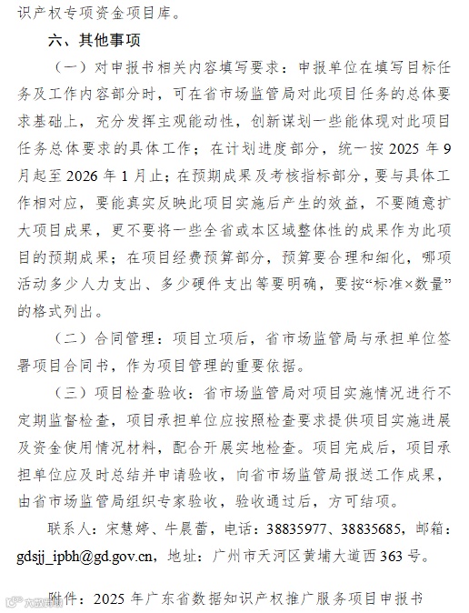根据《广东省省级财政专项资金管理办法(修订)》(粤府〔2023〕34号)、《广东省财政厅 广东省市场监管局关于印发〈广东省市场监督管理局(知识产权局)经管省财政专项资金管理办法(2024年修订)〉的通知》(粤财工〔2024〕2号)相关要求,省市场监管局决定组织开展2025年知识产权保护类专项资金第二批保留省级项目申报工作。现将申报指南印发给你们,并就有关申报事项通知如下。