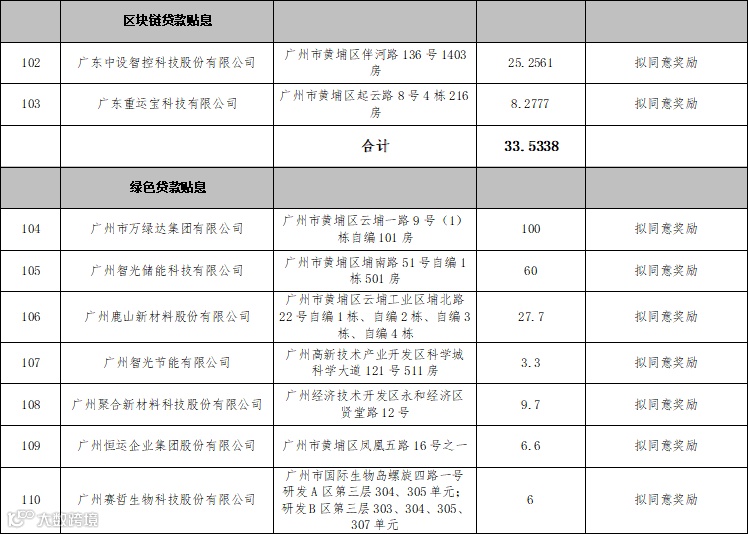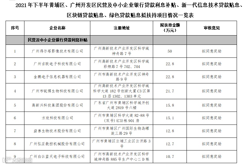 附表:2021年下半年黄埔区、广州开发区民营及中小企业银行贷款利息补贴、新一代信息技术贷款贴息、区块链贷款贴息、绿色贷款贴息拟扶持项目情况一览表