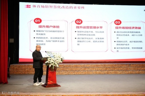 四川省体科数字智慧体育场馆有限公司董事/北京动网天下科技有限公司董事长 梅子佳等企业代表就数字技术服务体育场馆开放服务与安全管理、IP赛事赋能体育场馆、智慧物联网在体育场馆中的设计改造与应用和场馆看台座椅在三大赛事应用及创新进行“新”分享。