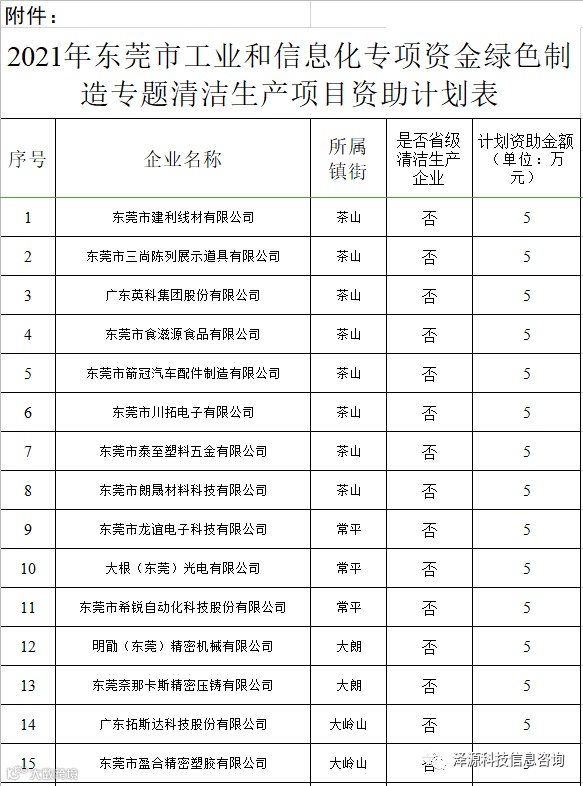 关于2021年东莞市工业和信息化专项资金绿色制造专题清洁生产项目资助计划的公示