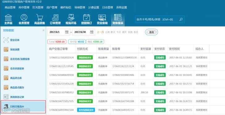 一级合作商户,使用【动网帮你订】系统进行扫码收银的,可通过:财务报表->扫码交易流水,进行支付收款记录的查询和对账,如下图: