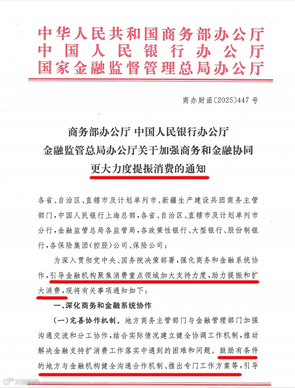 为贯彻这一决策部署,商务部、中国人民银行、金融监管总局联合印发《关于加强商务和金融协同更大力度提振消费的通知》,围绕商品消费、服务消费、新型消费等重点领域,推出一系列切实举措。