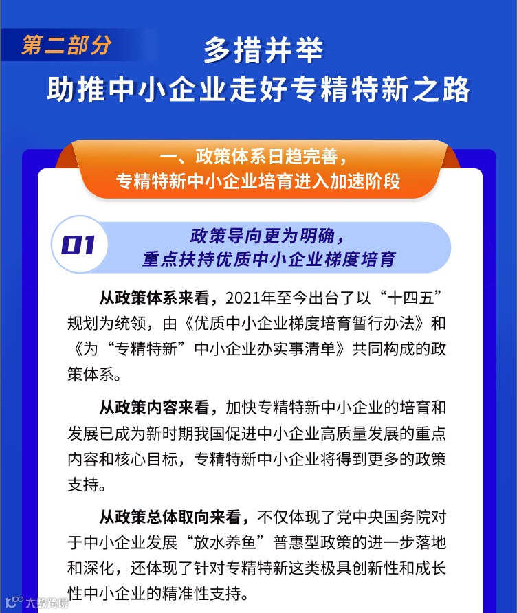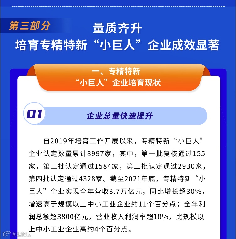 中国中小企业发展促进中心、中国信息通信研究院、中国工业互联网研究院编制发布《专精特新中小企业发展报告(2022年)》,全面展示专精特新中小企业的发展成绩,系统介绍我国推动中小企业走专精特新发展道路、提升创新能力和专业化水平的主要政策和举措,发挥专精特新中小企业的示范引领作用。