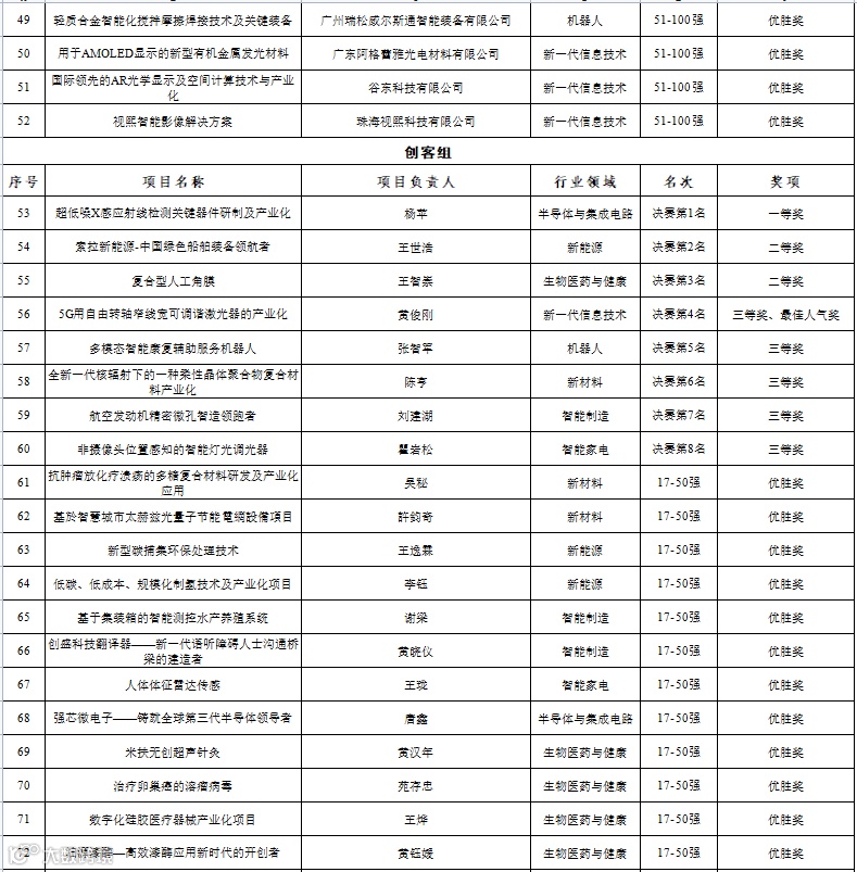 创客广东”大赛组委会关于第七届“创客中国”广东省中小企业创新创业大赛暨第六届“创客广东”大赛获奖名单的公示