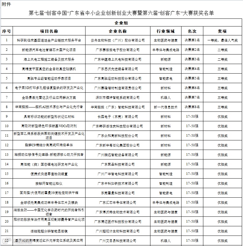 附件:第七届“创客中国”广东省中小企业创新创业大赛暨第六届“创客广东”大赛获奖名单