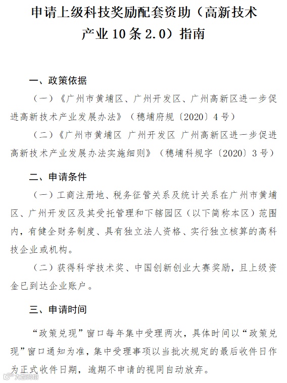 市黄埔区、广州开发区、广州高新区进一步促进高新技术产业发展办法的通知》(穗埔府规〔2020〕4号)、《广州市黄埔区 广州开发区 广州高新区进一步促进高新技术产业发展办法实施细则》(穗埔科规字〔2020〕3号),我局将开展2022年上半年集中受理上级科技奖励配套资助工作,本次集中受理适用于2021年1月至本次集中受理截止