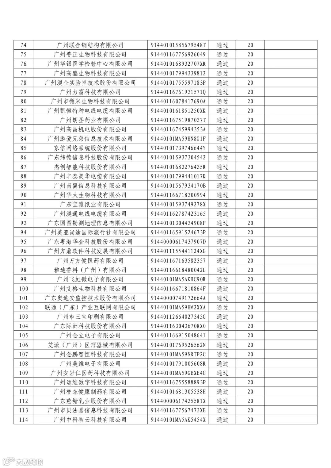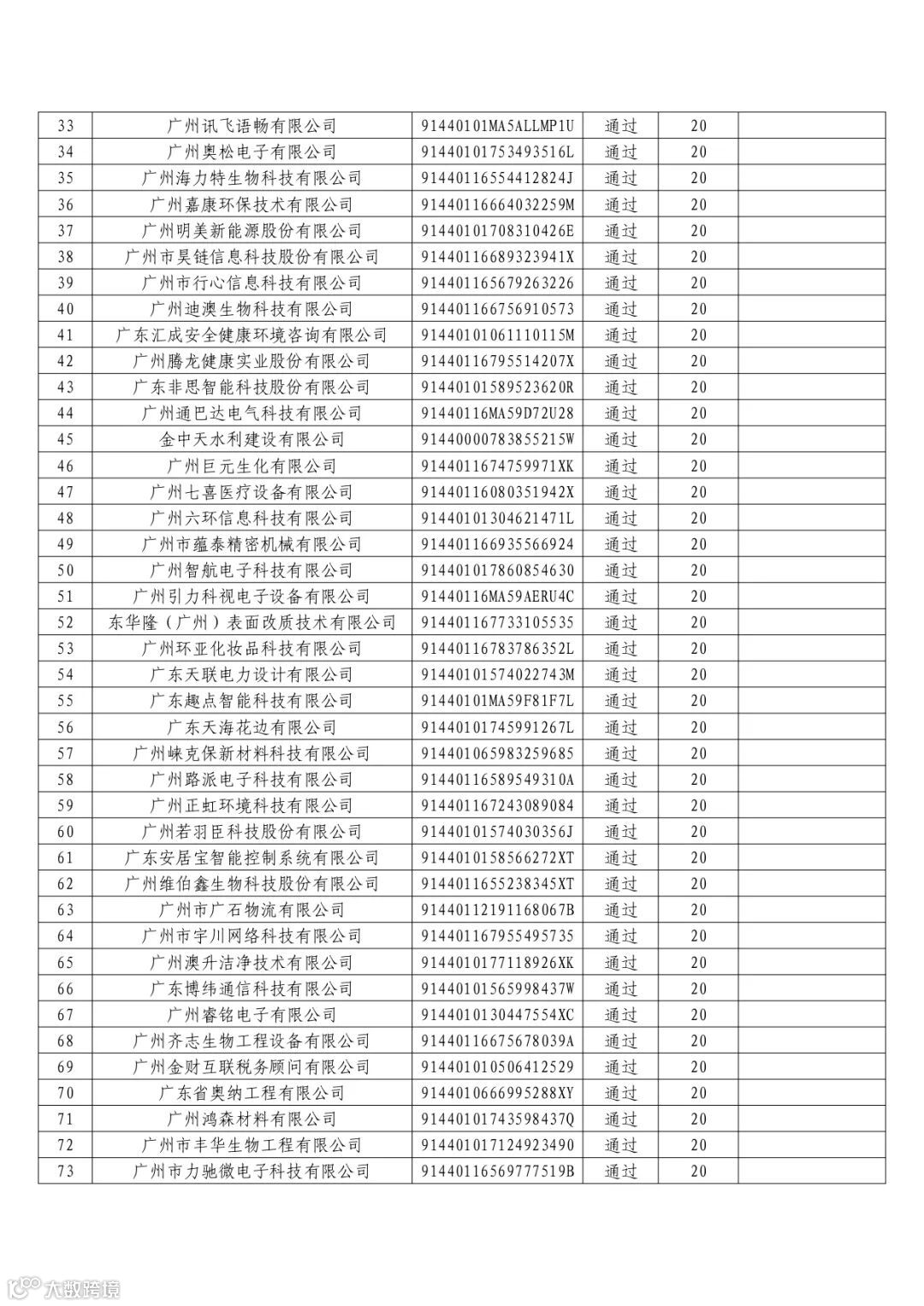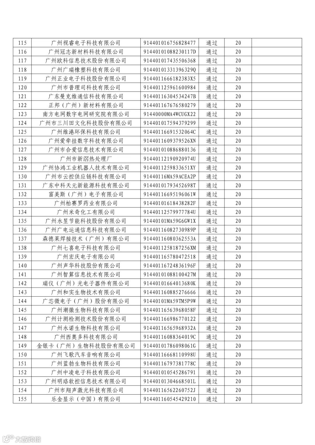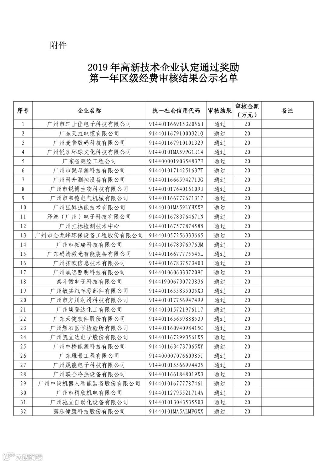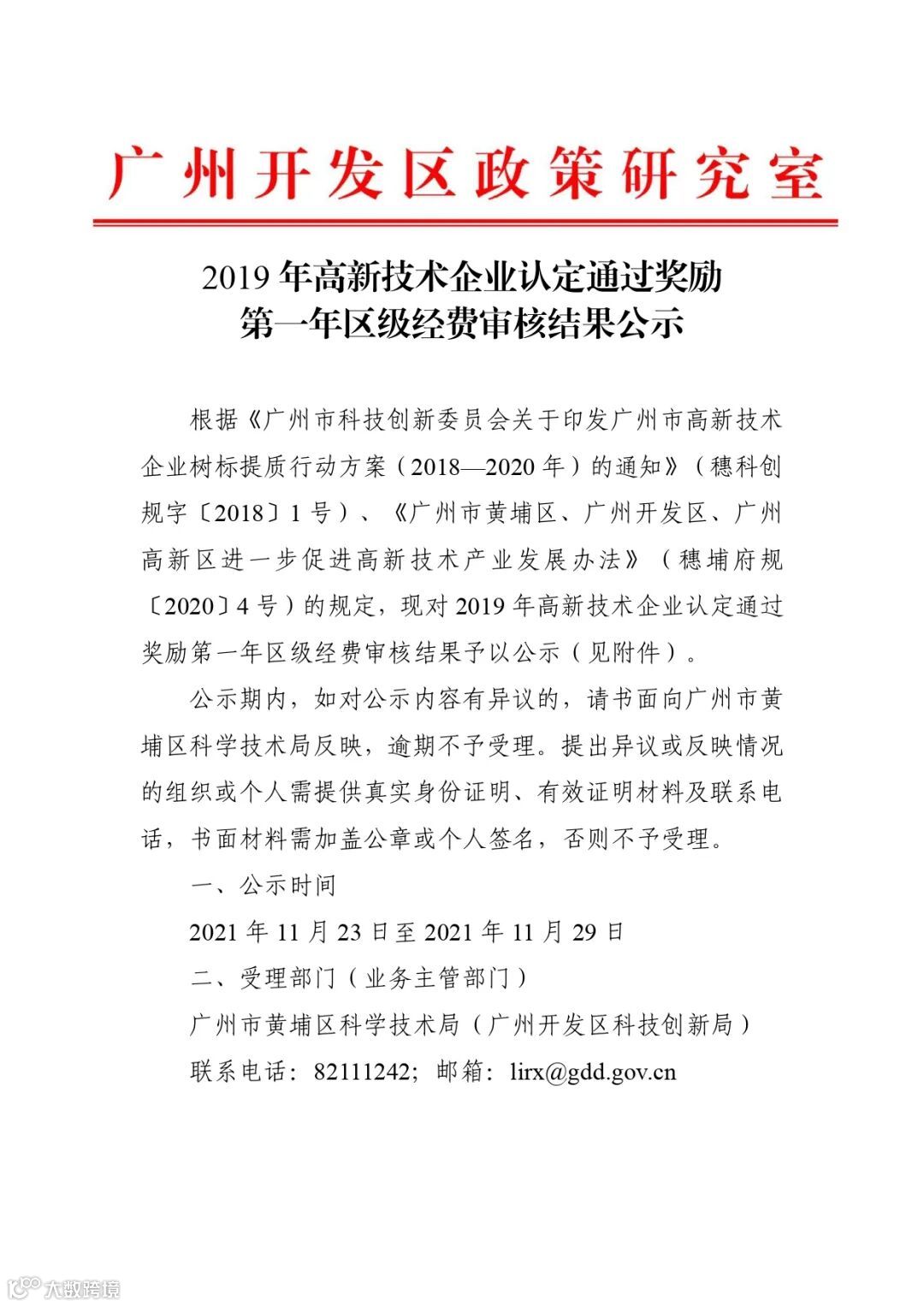 根据《广州市科技创新委员会关于印发广州市高新技术企业树标提质行动方案(2018—2020年)的通知》(穗科创规字〔2018〕1号)、《广州市黄埔区、广州开发区、广州高新区进一步促进高新技术产业发展办法》(穗埔府规〔2020〕4号)的规定,现对2019年高新技术企业认定通过奖励第一年区级经费审核结果予以公示(见附件)。