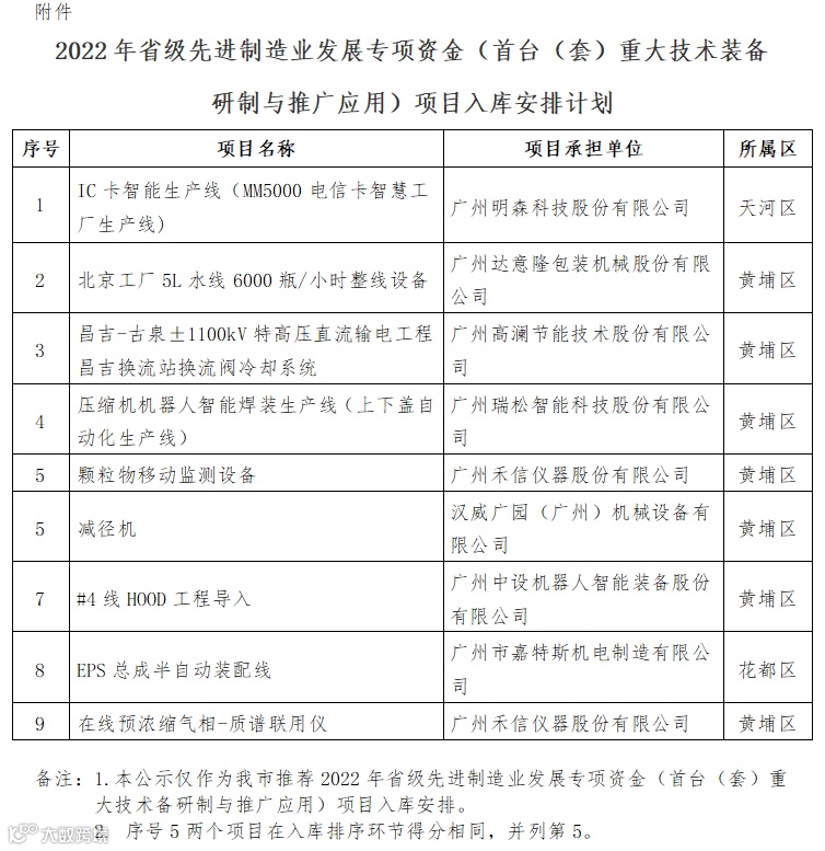 广州市工业和信息化局关于2022年省级先进装备制造业发展资金(首台(套)重大技术装备研制与推广应用)项目入库安排计划的公示