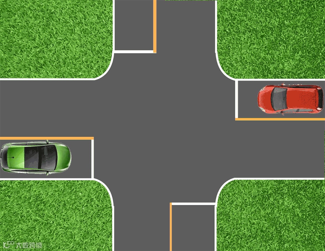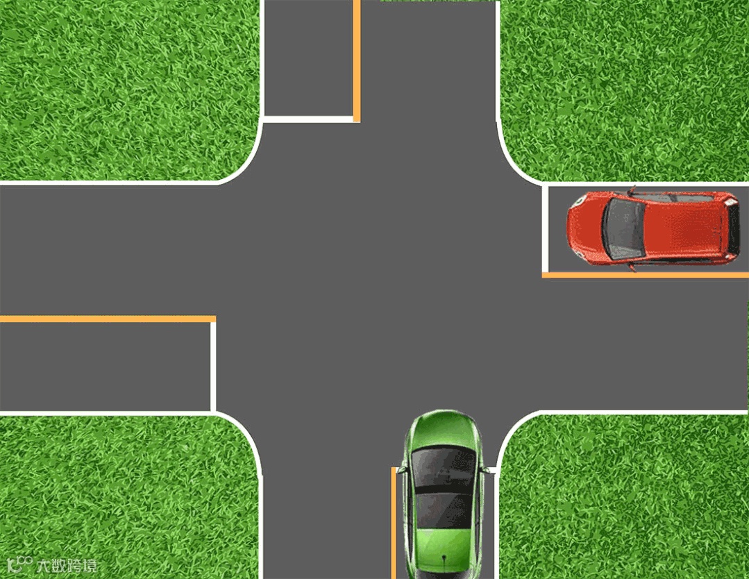上面两种情况都是直行的绿车与转弯的红车碰撞,红车全责