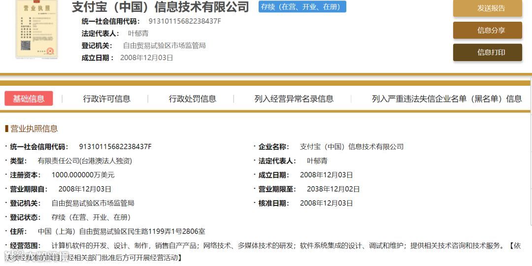据消息了解,8月29日有媒体在国家企业信用信息公示系统显示,支付宝(中国)信息技术有限公司的股东为ALIPAY CHINA HOLDING LIMITED,其法定代表人在2018年8月29日发生变更,由马云变更为叶郁青。
