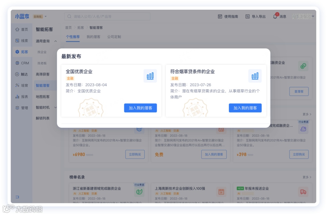 针对金融行业的市场目标客户特征,例如提供个贷业务、烟草贷业务的企业,在拓客过程中效率低、客户不精准是常见痛点,小蓝本新上线两个定制潜客包:【全国优质企业】、【符合烟草贷条件的企业】,帮助有这类业务需求的企业快速定位精准客户,提升企业获客效率!