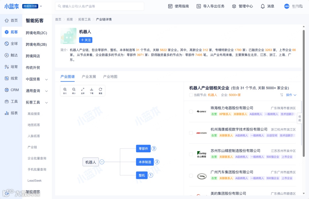 通过该系统,企业能精准识别并追踪产业链中的潜在客户与合作伙伴,依托数据分析支撑市场动态研判与趋势预测,让获客从“盲目搜寻”转向“精准出击”。