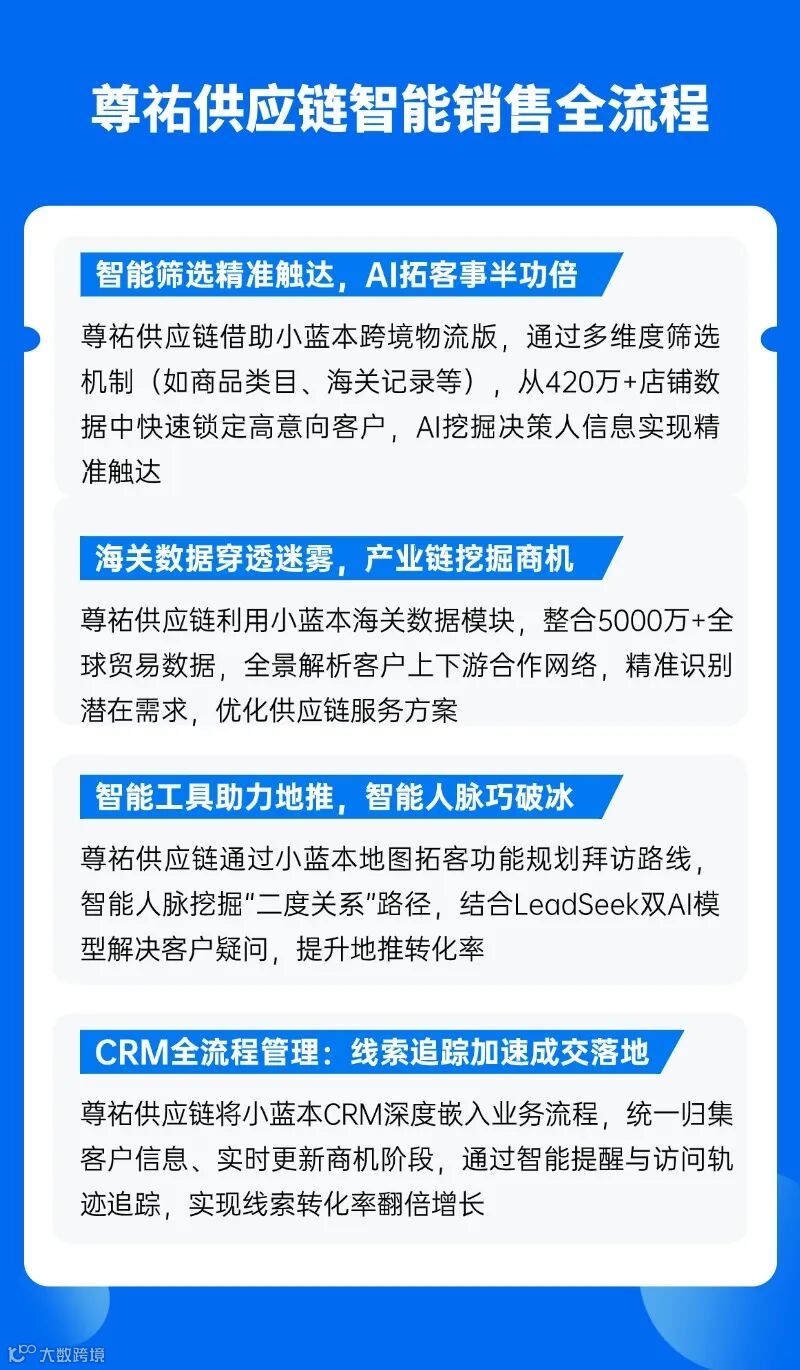 经过多轮测试与对比,尊祐供应链最终选择了小蓝本跨境物流版。相比其他工具,它不仅拥有更全面的跨境电商数据资源,还能通过AI+大数据技术深入挖掘海关数据和产业链,同时结合地图拓客、智能人脉、CRM客户管理等功能,真正实现了从找客户到管客户的全流程闭环。更重要的是,它的操作逻辑清晰、功能模块灵活、性价比优势明显,完全契合尊祐供应链当前的发展阶段和业务需求。于是,他们果断决定携手小蓝本跨境物流版,开启数字化获客的新篇章。