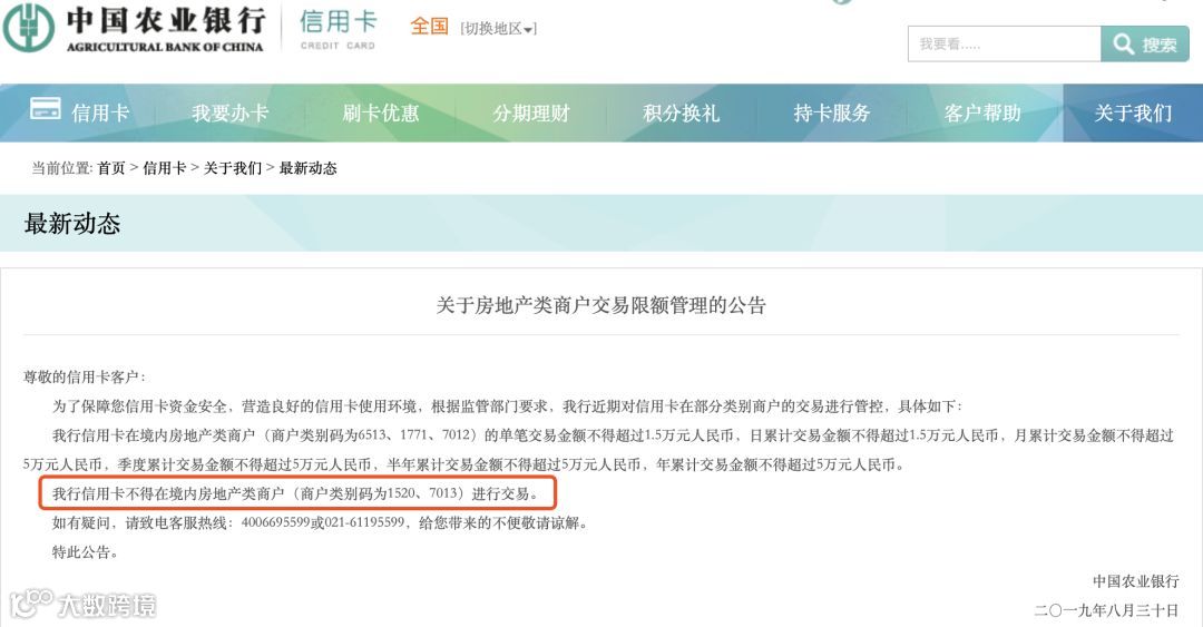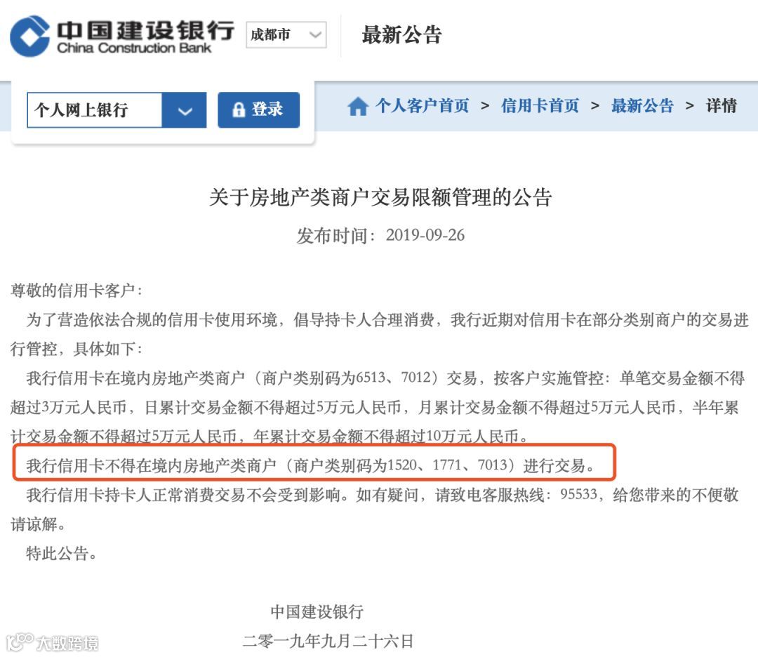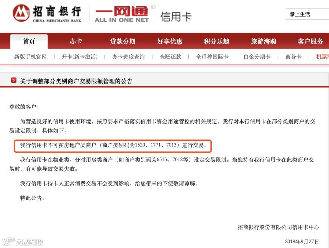 以招行为例,9月27日,招行信用卡中心发布公告称,该行信用卡不可在3类房地产类商户(商户类别码为1520、1771、7013)进行交易;在物业类、分时用房类商户(如商户类别码为6513、7012等)设定交易限制。当客户持有该行信用卡在这些商户交易时,有可能导致交易失败。