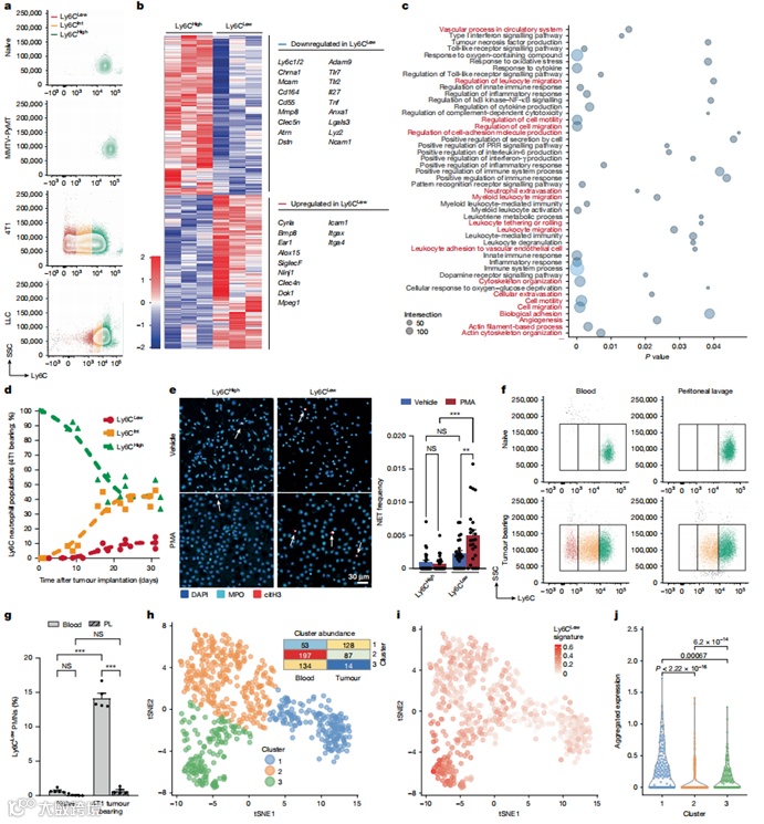在荷瘤小鼠中性粒细胞的表型改变中,最令人意外的是血液中出现Ly6G高Ly6C低的亚群(中性粒细胞通常高表达Ly6C,但低于单核细胞)。这种Ly6C低中性粒细胞仅存在于4T1和LLC荷瘤小鼠(图4a)。通过RNA-seq分析发现,Ly6C低中性粒细胞高表达Cyria(Rac1抑制剂)、Dok1(抑制整合素活化)、Icam1(细胞黏附分子)、Itgax(CD11c)和Itga4(纤连蛋白受体),低表达Ly6c1/2等基因(图4b)。基因本体分析显示差异基因涉及炎症反应、翻译调控及细胞迁移通路,而外渗相关通路显著下调(图4c)。流式检测证实Ly6C低中性粒细胞表面CD62L、SiglecF、CXCR2、CXCR4、ICAM1和CD11c表达改变。