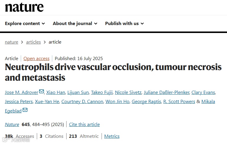 近日,发表于《自然》(Nature)杂志的研究“Neutrophils drive vascular occlusion, tumour necrosis and metastasis”,由美国冷泉港实验室等机构的科学家完成。该研究深入揭示了中性粒细胞如何通过引发血管堵塞驱动肿瘤坏死,并进一步促进肿瘤转移,为理解肿瘤进展机制及开发新疗法提供了重要视角。