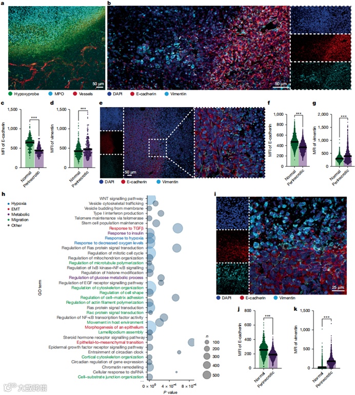 肿瘤坏死在癌症患者和动物模型中均与转移相关,但坏死癌细胞本身无法转移,因此我们重点分析了坏死周边区域的变化。值得注意的是,多形性坏死肿瘤的周边区域比传统中央坏死肿瘤更广泛(扩展数据图4a)。缺氧区域几乎全部位于坏死周边(图2a),因此我们以缺氧作为坏死周边的标志。在4T1肿瘤单细胞RNA测序(scRNA-seq)数据中,缺氧癌细胞除表达Hif1a和Vegfa外,还高表达Cxcl1、Ddit4、Egr1(诱导TGFβ表达)、Mcl1、Tnc(促进肿瘤迁移)、Limd1(抑制E-cadherin表达)和Ltbp1(增强TGFβ活性并促进上皮-间质转化(EMT))。基因本体分析显示缺氧癌细胞差异表达基因涉及迁移、TGFβ信号和EMT通路。在C3(1)-Tag肿瘤scRNA-seq数据中也发现类似基因变化。