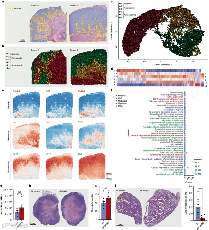 为验证TGFβ的作用,我们构建了表达显性负性TGFβ受体(dnTGFβR2)的4T1细胞。虽然dnTGFβR2肿瘤的坏死程度和NETs形成未受影响(图3g-h),但周边区EMT标志物改变消失,肺转移显著减少(图3i)。通过多组学技术证实,坏死周边区TGFβ主要由巨噬细胞分泌。