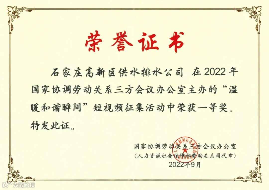 近日,高新区供水排水公司报送的短视频作品和图片作品在2022年国家协调劳动关系三方会议办公室主办的“温暖和谐瞬间”作品征集活动中分别荣获短视频一等奖和图片一等奖,彰显了高新区全面推动和谐劳动关系创建行动中取得的成绩,为高新区全面打造一流营商环境做出了积极贡献。