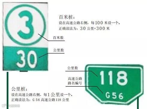 百米桩隔100米就有一个,上面标注的百米数和公里数。