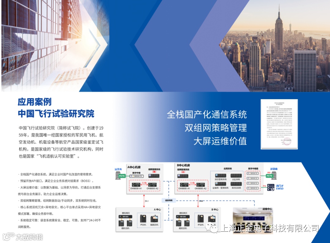 在实践项目中,迅时不断积累信创类实施案例。比如,采用IP融合通信系统对中国飞行试验研究院两大基地的语音系统分别进行全新建设和改造升级,提供双组网策略管理、数据大屏可视化运维、核心系统双机冗余+异地容灾,以全栈国产化通信系统满足企业对国产化改造的使用需求。